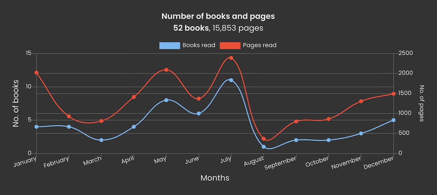 While reading 52 books over 52 weeks might sound like a steady pace of one book per week, my reading habits were very inconsistent. For example, during the height of my solo backpacking trip through Asia, I finished 11 books in July. In contrast, while visiting my sister in Australia and moving to Italy in August, I managed to finish only one book. To be fair, though, part of that time was spent working my way through the nearly 1,000-page epic The Pillars of the Earth.